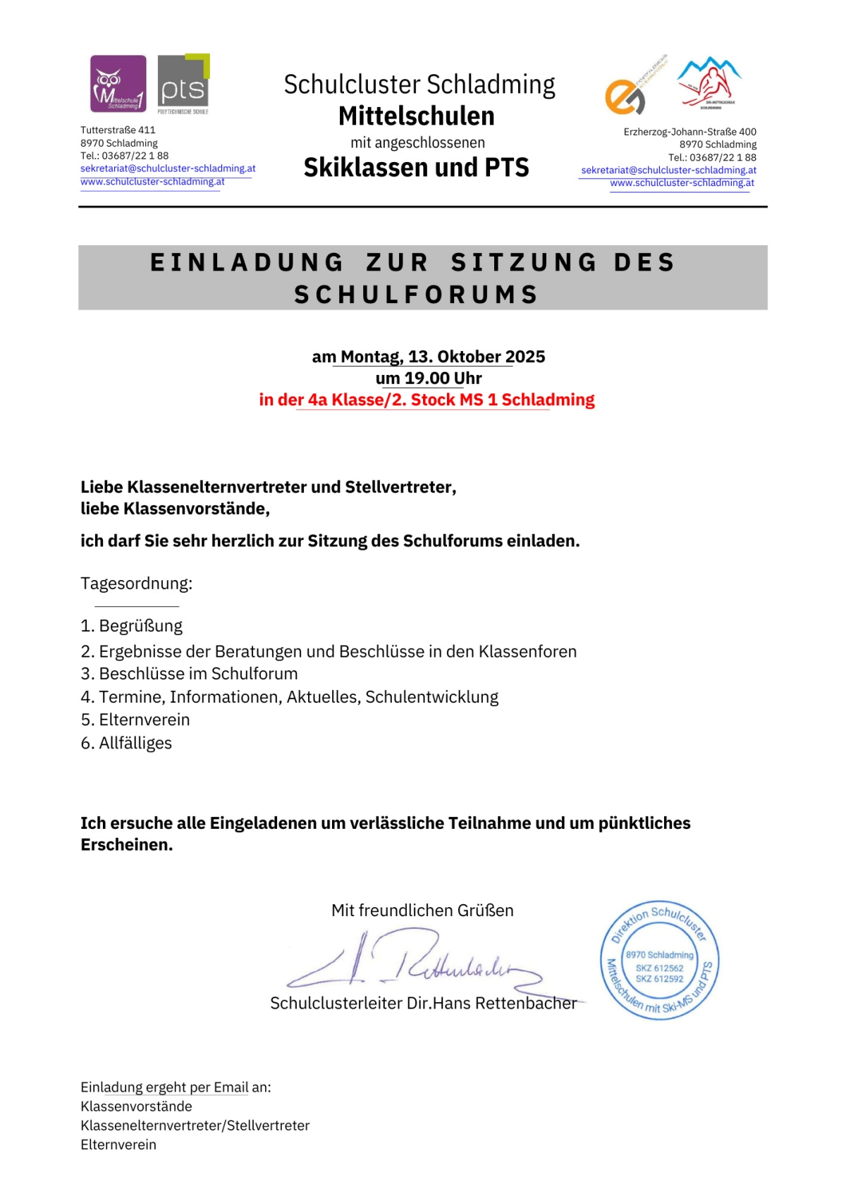Die Schülerinnen und Schüler der 1. Klassen MS dürfen wir am Montag, dem 8. September 2025 um 8.15 Uhr, die Schülerinnen und Schüler der PTS-Klassen um 7.35 Uhr im Parterre (Eingangsbereich) begrüßen.