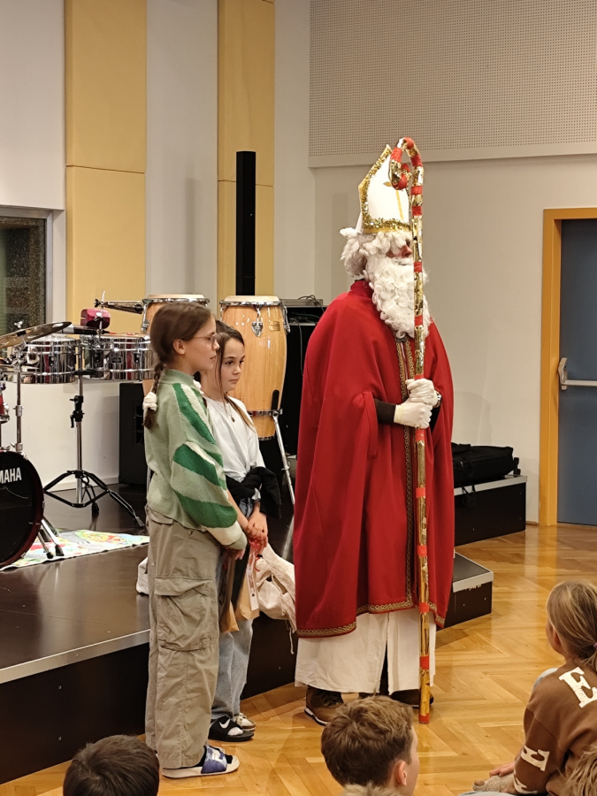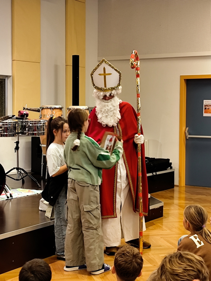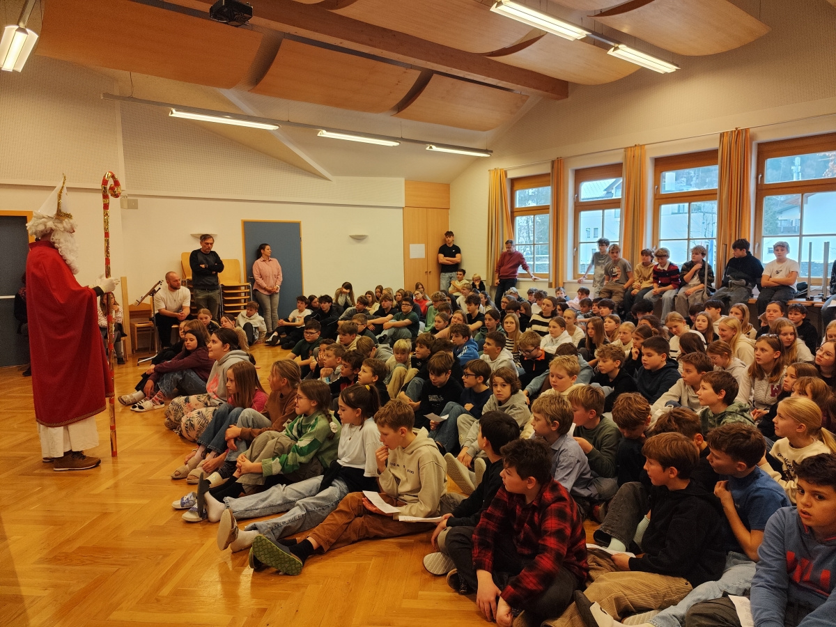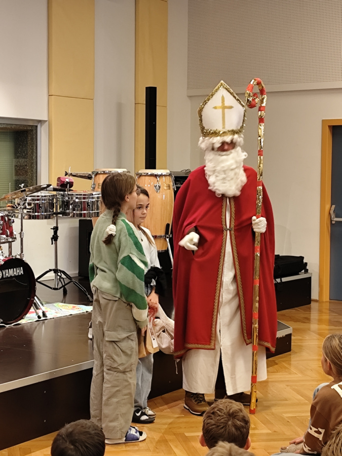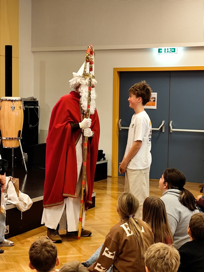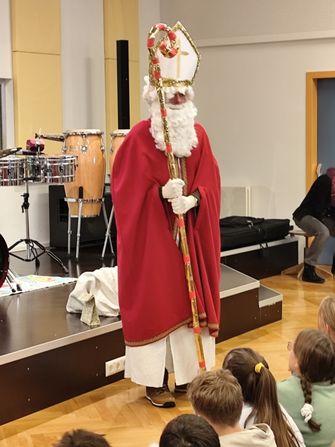 Der Nikolaus erzählte vom bewegten Leben und Wirken des Heiligen. Die Schülerinnen und Schüler lauschten den Geschichten über seine guten Taten, seinen Mut und seine Hilfsbereitschaft - Werte, die auch für die Schulgemeinschaft großen Stellenwert haben.